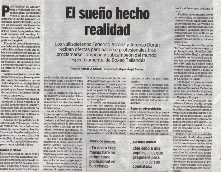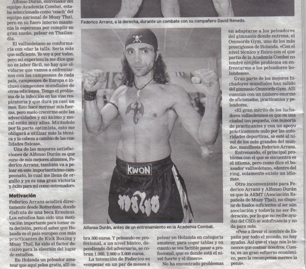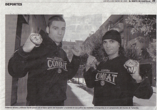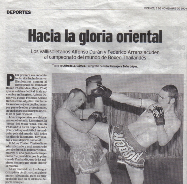 El día 4 de Noviembre salen para Thailandia , Bangkok, nuestros luchadores: Alfonso Durán y Federico Arranz. Se dirigen al CAMPEONATO MUNDIAL DE MUAY THAÏ, siendo la primera vez que dos Vallisoletanos llegan tan lejos en este mundillo. La noticia tiene aún mayor relevancia porque Alfonso, después de luchar por todos los medios para no ir “tan solo” como Entrenador (Coach del equipo nacional) ha sido nombrado “Miembro del Equipo Nacional de Muay Thaï” con lo cual, nuestra ciudad y nuestra Academia contarán en Thailandia con 2 representantes. Los mejores deseos para nuestros dos Combat Fighters!!!!!!!